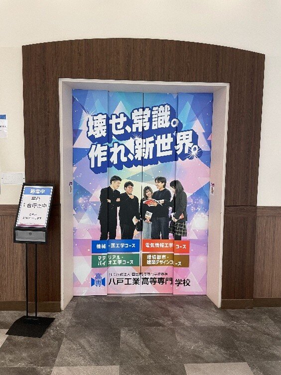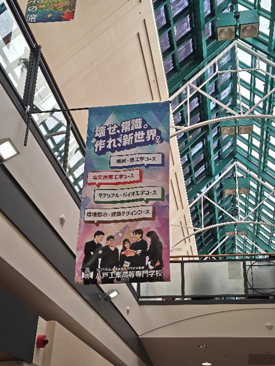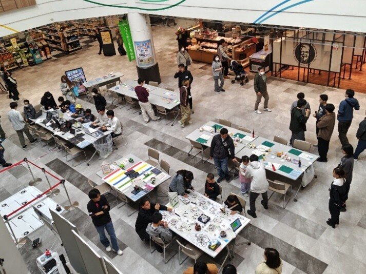 八戸高専では11月2日、八戸市に隣接するおいらせ町の商業施設において「ミニまちなか文化祭」と題した広報イベントを実施しました。このイベントは八戸産学官連携推進会議の主催により、イオンモール下田30周年記念自治体ジャックイベントの一環として行われたものです。八戸圏域に所在する高等教育機関及び企業等の事業者が、店内のイベントスペースを利用した広報活動を行うもので、本校からは「ろぼっと娘」、「電子情報工学部」、「井関研究室」、「ボードゲーム愛好会」の4団体が出展しました。女子学生を中心としたプログラミング教育ボランティア愛好会「ろぼっと娘」によるロボット操作紹介や、風船で走るペーパーカーを作る「バルーンカーをつくってみよう(井関研究室)」などの体験コーナーは、就学前の児童も含めて幅広い年代の家族連れで賑わいました。また、研究成果として学生が製作したオリジナルゲームの展示なども行われたほか、来場者には、入試広報と併せて今後のイベント情報を掲載したフライヤーを配布するなど、八戸高専の魅力を知っていただく貴重な機会とすることができました。なお、体験イベントはこの日のみの開催でしたが、エレベータドアのラッピングや通路バナー、吹抜通路へのフラッグ掲出は、11~12月の2か月間展開される予定です。